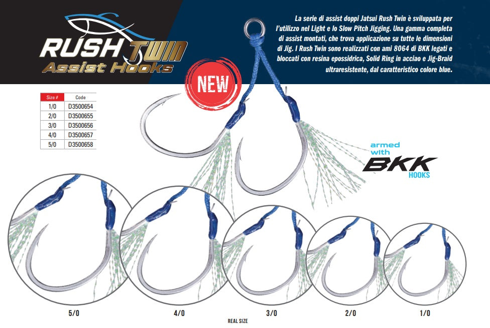 La serie di assist doppi Jatsui Rush Twin è sviluppata per l'utilizzo nel light e lo slow pitch jigging, una gamma completa di asssist montati che trova applicazione su tutte le dimensioni di jig.