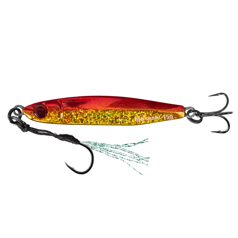 Sapientemente progettati da un Team Giapponese per dare due diverse azioni in caduta: quando i jig Mezashi cadono il loro lato squadrato rivolto verso il basso danno una bella azione di scivolamento; Quando invece cadono sul lato arrotondato, si vede uno svolazzare allettante. Per rendere le cose ancora migliori, quando il jig viene recuperato, esso offre un'intensa azione oscillante che i predatori adorano!