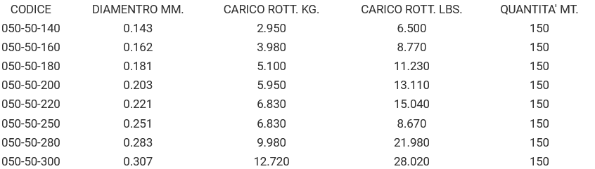 Grande resistenza alla trazione lineare.Totale assenza di memoria meccanica.Particolare scorrevolezza per lanci lunghi e precisiColore trasparente naturale