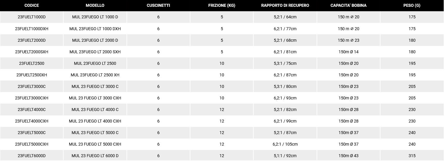 Il vasto assortimento di taglie (da 1000 a 6000), unitamente a robustezza, compattezza e resistenza alla salsedine rendono il Fuego il mulinello ideale per le più disparate tecniche di pesca, comprese quelle gravose in acqua salata.